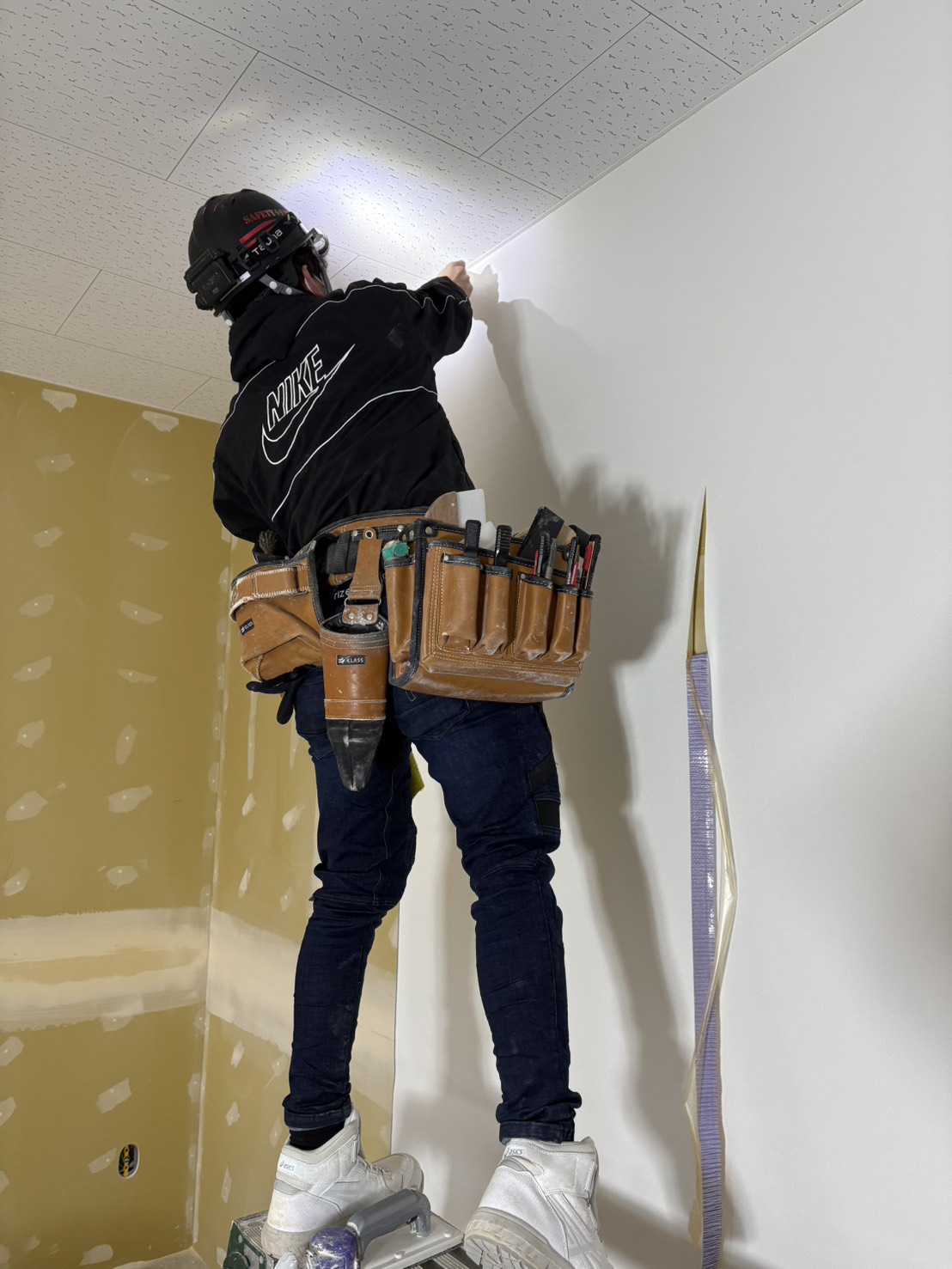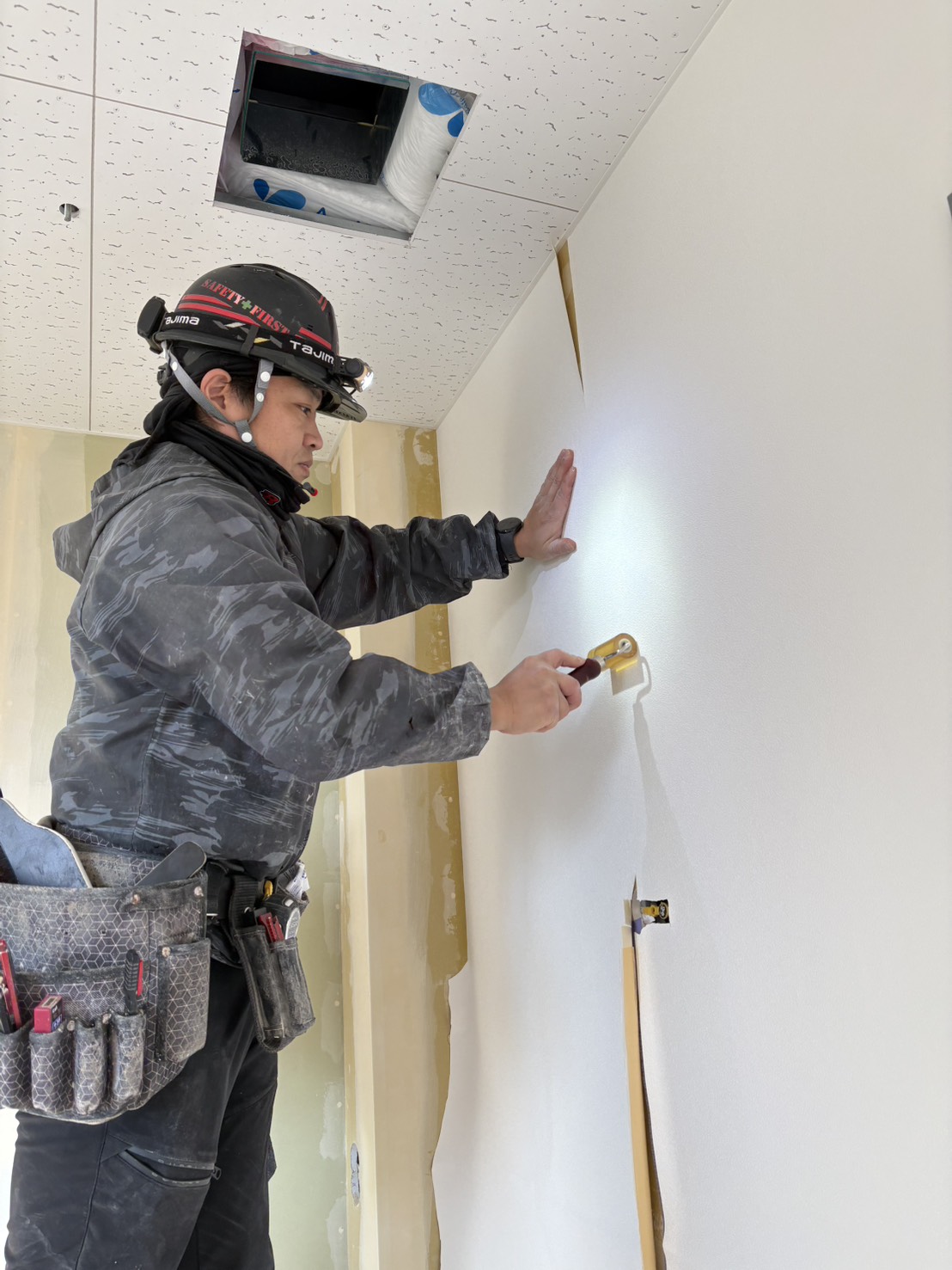 現在はクロス工事を中心に床工事と共に、マンション・戸建て・店舗など幅広い現場に対応し、元請け様や工務店様と長く信頼関係を築ける仕事を目指しています。
